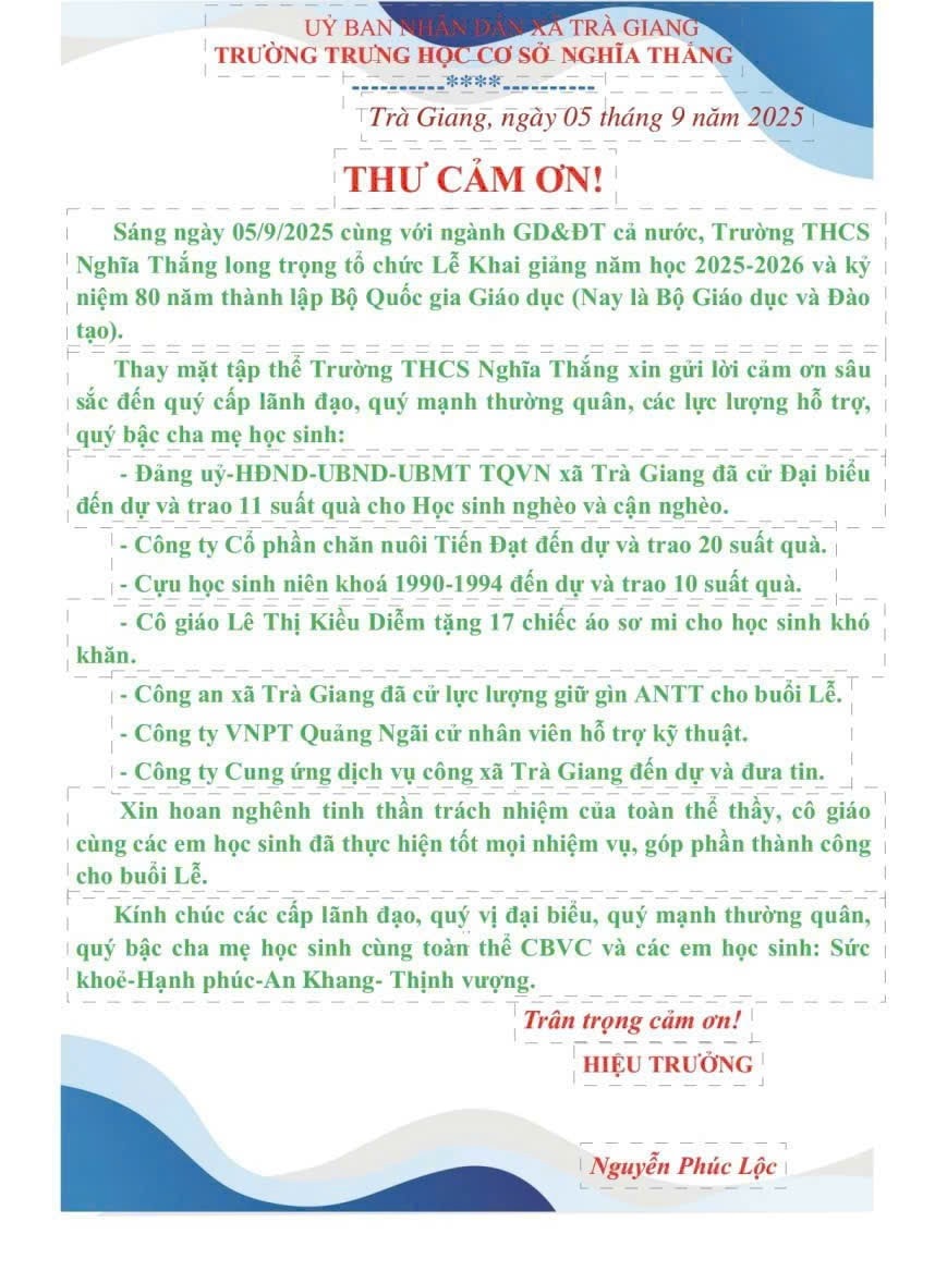 Hòa chung không khí thiêng liêng ngày khai trường của cả nước, hôm nay, ngày 5/9/2025 Trường THCS Nghĩa Thắng chính thức tổ chức Lễ Khai giảng năm học 2025-2026 và Kỉ niệm 80 năm thành lập Bộ quốc gia Giáo dục.